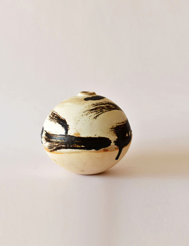 Orb vase painted with rust using Japanese brushes and enameled top; some pieces have my fingerprints, a Japanese technique as evidence of being handmade.